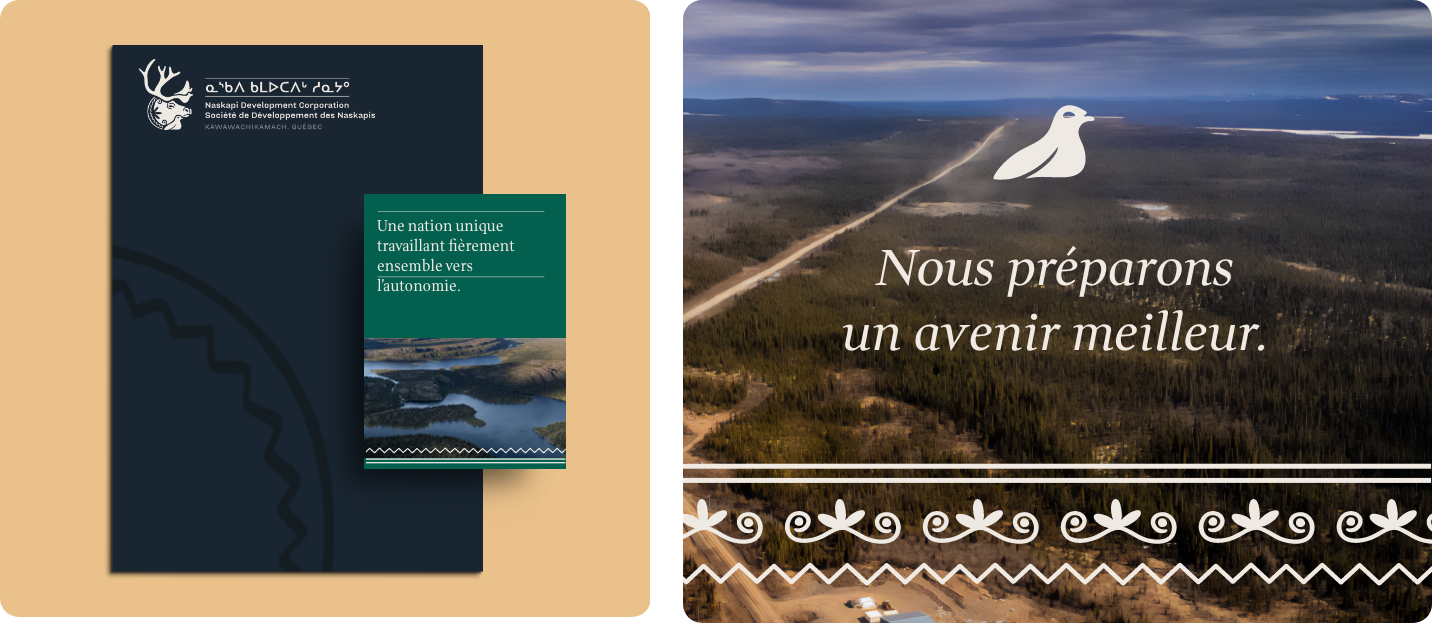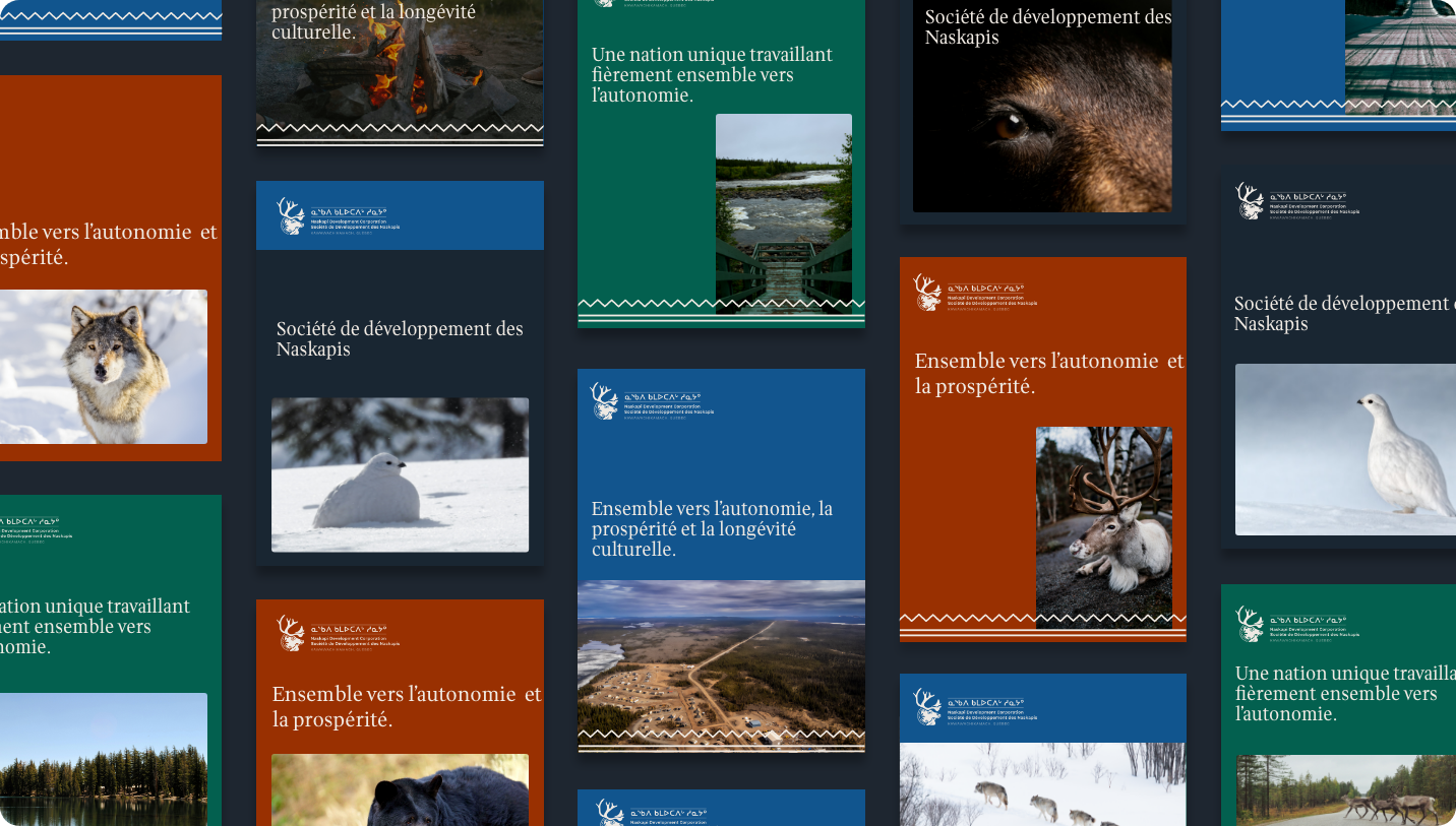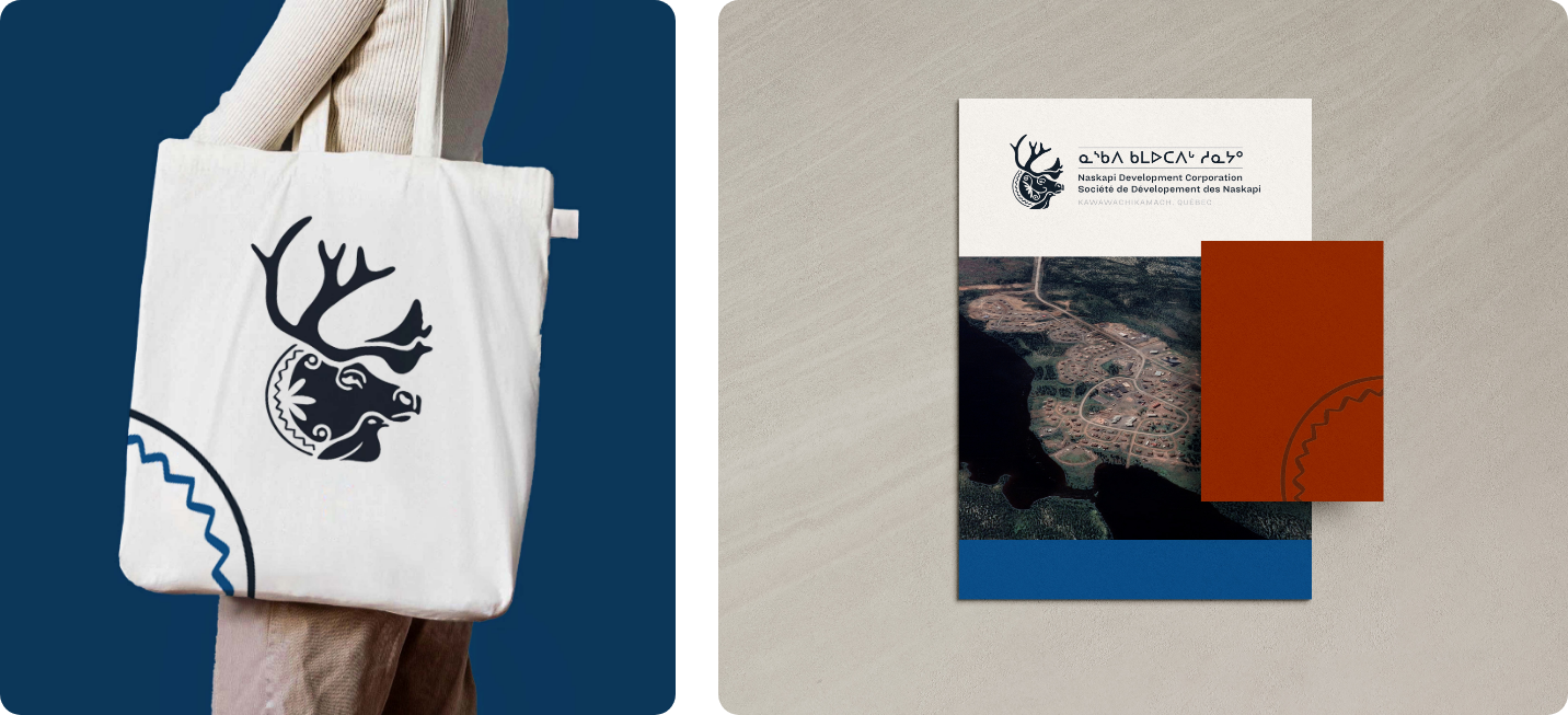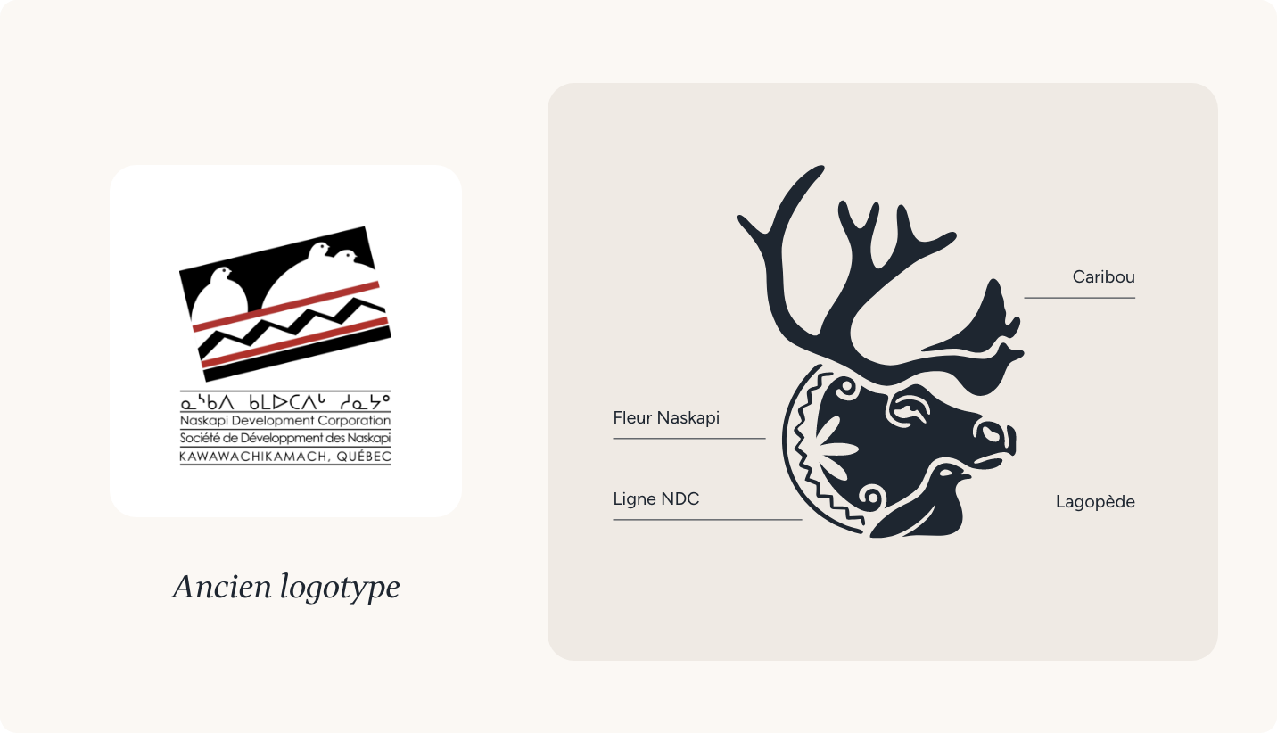 Nous avons imaginé une image de marque rassembleuse, enracinée et contemporaine. Le nouveau logo, inspiré de l’art traditionnel naskapi, adopte un style dessiné à la main évoquant les formes organiques et l’artisanat ancestral. Il met en scène trois symboles clés : le caribou, figure de résilience, en posture protectrice ; le lagopède, symbole d’adaptabilité et de sagesse ; la fleur traditionnelle naskapie, vecteur de culture et de transmission. Un motif linéaire accompagne le tout, illustrant le cheminement du peuple naskapi, entre continuité, épreuves et renouveau. Cette identité se décline à travers une palette de couleurs riches, des textures et des icônes évoquant la nature.