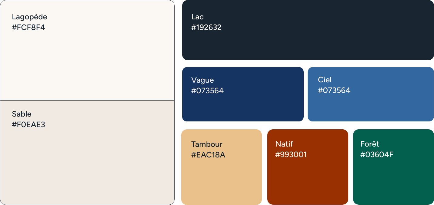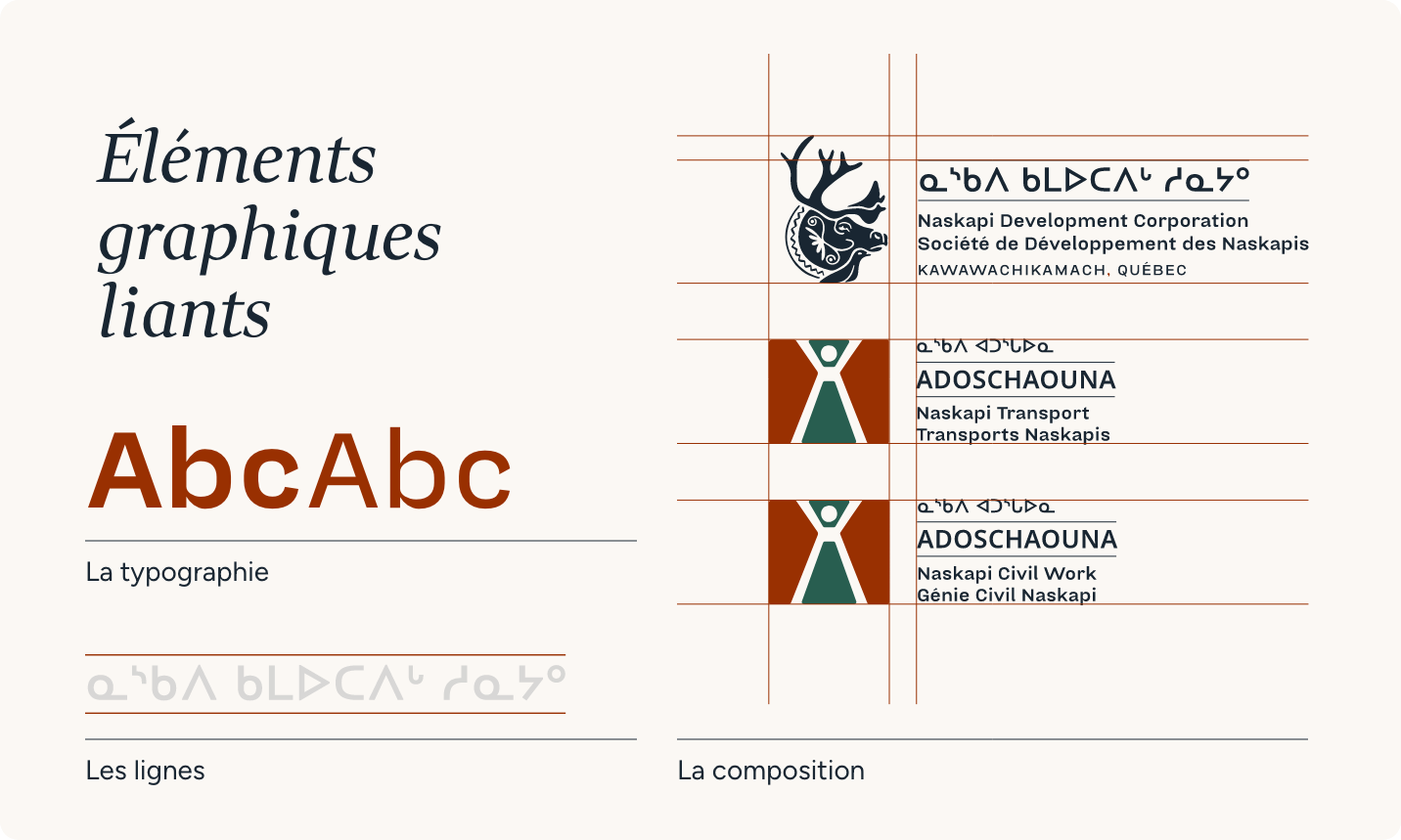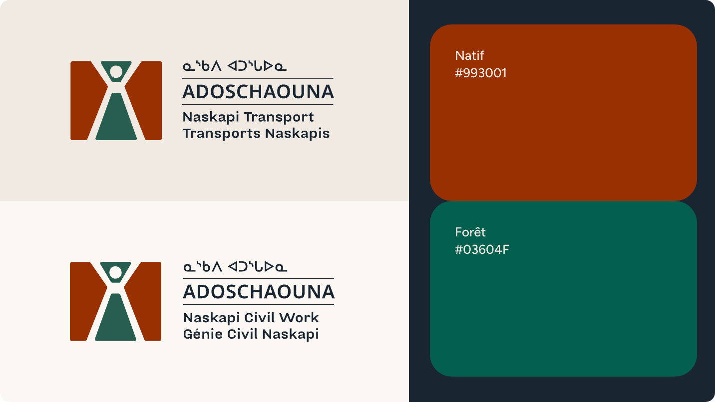 Nous avons imaginé une image de marque rassembleuse, enracinée et contemporaine. Le nouveau logo, inspiré de l’art traditionnel naskapi, adopte un style dessiné à la main évoquant les formes organiques et l’artisanat ancestral. Il met en scène trois symboles clés : le caribou, figure de résilience, en posture protectrice ; le lagopède, symbole d’adaptabilité et de sagesse ; la fleur traditionnelle naskapie, vecteur de culture et de transmission. Un motif linéaire accompagne le tout, illustrant le cheminement du peuple naskapi, entre continuité, épreuves et renouveau. Cette identité se décline à travers une palette de couleurs riches, des textures et des icônes évoquant la nature.